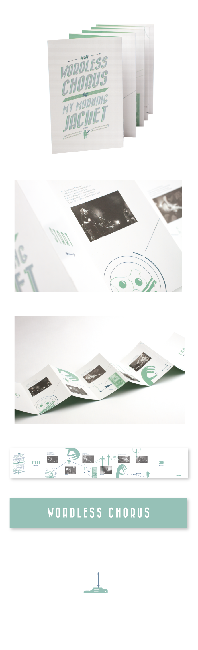 Accordion booklet with lyrics and illustration for My Morning Jacket's song, Wordless Chorus.
